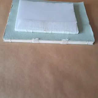 Conjunto de dos libros de papel artesanal cosido a mano y encolado. - Papel de color crudo interior, verde claro las hojas exteriores el de mayor tamano (guardas). - Medidas 32x22, con 34 hojas+guardas. 22x17 con 48 hojas. - Precio por los dos.