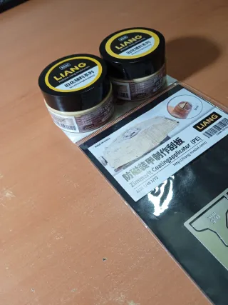 Set de herramientas LIANG para aplicar el recubrimiento Zimmerit en maquetas. - Incluye aplicador de fotograbado (PE). - Dos botes de material para Zimmerit. - Escalas 1/35 y 1/72.