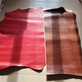 Dos retales de piel con un bonito relieve grabado, uno en color rojo y otro en marrón. Medidas Rojo 1,20x96, grueso 2,5 mm. Medidas marron 1,30x65, grueso 3 mm. - Piel con textura. - Colores: rojo y marrón.