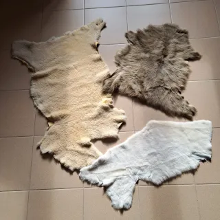 - Conjunto de tres retales de piel con pelo. -Tres pieles de diferentes tamaños y colores. - Ideales para manualidades o decoración. - Precio por las tres.