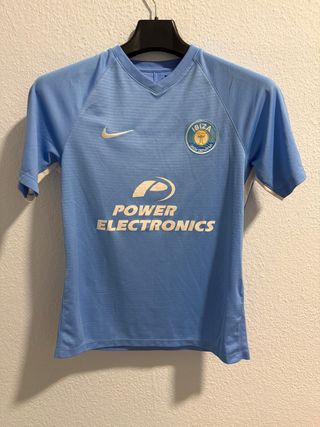 Camiseta de la Unión Deportiva Ibiza de la temporada 2018/2019, modelo local. - Color azul claro. - Logo de Nike en blanco. - Escudo del club en el pecho. - Patrocinador 'Power Electronics' en grande.