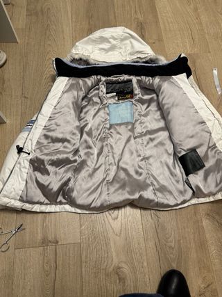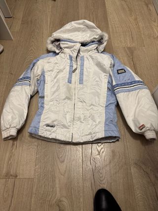 Anorak de esquí para niña de la marca Spyder. - Color blanco y azul claro. - Capucha con pelo sintético. - Cremallera frontal. - Puños elásticos.