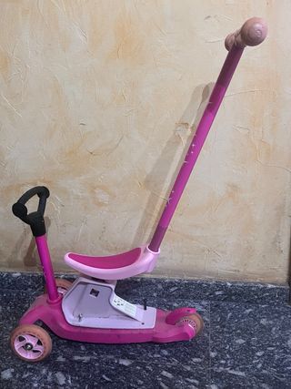 Patinete infantil de color rosa con asiento y manillar adaptable. - Asiento extraíble. - Manillar ajustable en altura. - Ruedas de plástico.