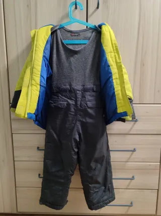 Conjunt de neu infantil talla 4-6, ideal per estades a la neu. - Jaqueta amb caputxa de colors blau, groc i gris - Pantaló de neu de color gris.