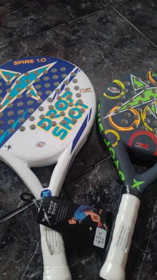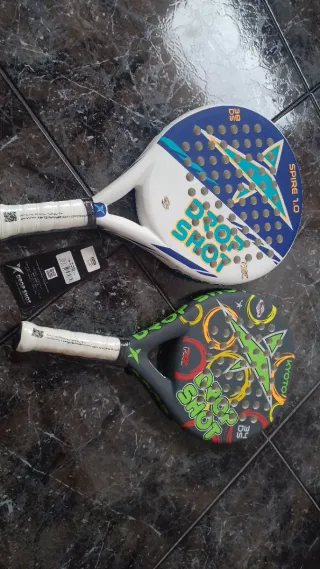 Dos palas de pádel Drop Shot con diseños llamativos. El precio es por la dos. Si sólo te interesa una, van a 36€ la unidad. - Pala superior blanca con detalles azules y verdes. - Pala inferior gris con detalles verdes, amarillos y naranjas. - Ambas con el logo de Drop Shot.