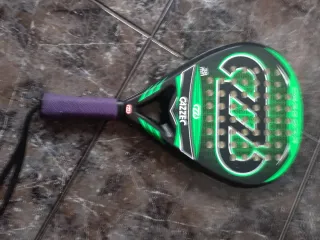 Pala de pádel CAZZEC DRAGONIA con un diseño llamativo en negro y verde. - Mango con grip morado. - Correa de seguridad negra. - Agujeros en la cara de la pala.