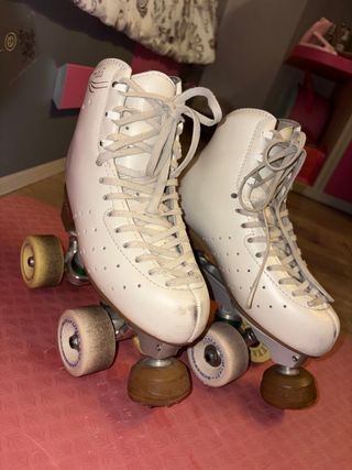 Patines profesionales de color blanco, talla 38. Listos para patinar. - Diseño clásico y elegante. - Ruedas amarillas de alta calidad. - Cierre con cordones.