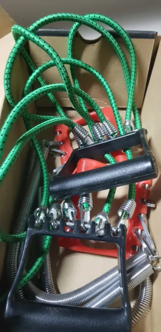 Set de ejercitadores para mantenerse en forma. Incluye mangos ergonómicos y resortes. - Mangos de plástico negro. - Resortes de metal. - Cuerda elástica verde. W5
