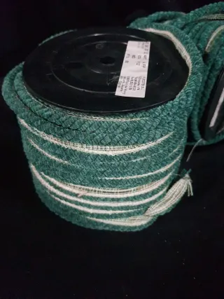 Se venden dos rollos de pasamanería con flecos, ideales para manualidades y proyectos de costura. - Color: Verde con detalles blancos. - Material: 79% Viscosa, 21% Acrílico. - Longitud: 50 metros por rollo. - Modelo: ART. 4 FP, COL 112, MED. C3. 141