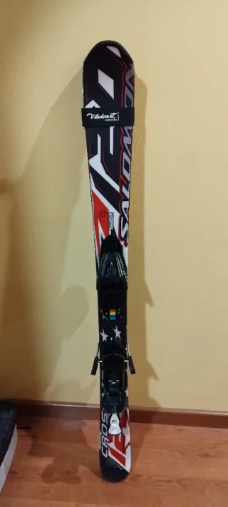 Conjunto de esquís Salomon CrossMax 120. - Diseño con detalles en rojo, blanco y negro. - Fijaciones Salomon negras. - Incluye bastones de esquí Salomon blancos con empuñaduras negras.
