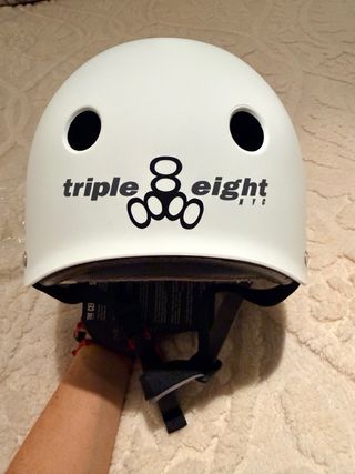 Casco de protección Triple Eight en color blanco mate, sin usar. - Diseño liso y moderno. - Cierre de hebilla ajustable. - Ventilación con orificios. - Caja original.