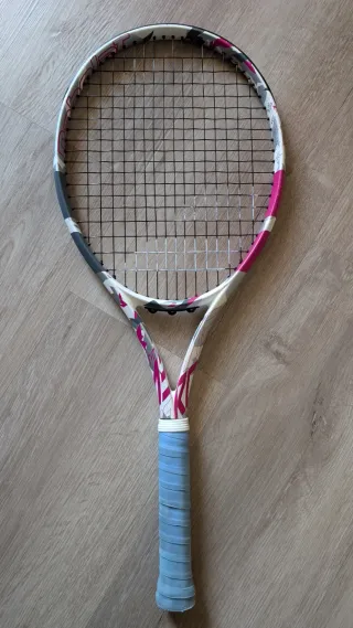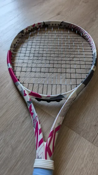 Raqueta de tenis con un diseño moderno y llamativo.Con su funda. Marco blanco con detalles en rosa y gris. Grip 2 Peso 275g Raqueta en buen estado con algo de uso, pero con pocos desperfectos. Entrega en mano, NO HAGO ENVIOS.