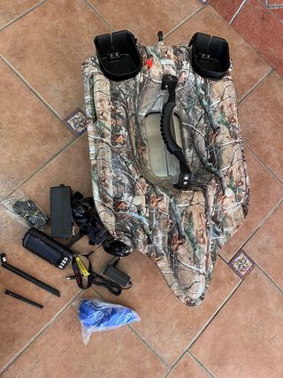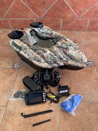 Barco cebador Fighter Pro, completamente nuevo. Características Principales: Diseño Compacto y Resistente: Dimensiones: Longitud. 67 cm, Ancho. 40 cm, Altura. 28 cm. Peso: aprox. 4.900 g Construido pensando en la durabilidad, con un casco robusto que soporta el uso intensivo. Capacidad de Cebo Superior: Cuatro tolvas que en conjunto permiten almacenar hasta 4 kg de cebo. Tolva doble central de gran capacidad (alrededor de 3000 g) y dos tolvas traseras independientes. Iluminación LED para Uso Nocturno: Equipado con luces LED delanteras (blancas) y traseras (rojas) empotradas para iluminar obstáculos sin deslumbrar. Po