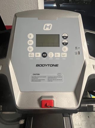 Cinta de correr de la marca BODYTONE. - Panel de control con pantalla LCD. - Botones de acceso rápido para velocidad (8, 10, 12). - Controles de reproducción y volumen. - Puerto USB y entrada MP3. - Botón de inicio/parada y selección de programas. - Llave de seguridad roja. SE ENTREGA MONTADA