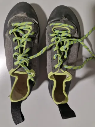 Pies de gato Simond para escalada, usados pero perfecto para iniciación. - Cierre con cordones. - Suela de goma. - Diseño en gris y negro con detalles en verde.