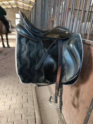 Montura de equitación, zaldi, modelo new kent, 18" con extra de gel en el asiento, de cuero negro, con detalles en contraste, estribos de seguridad, con cincha elástica. - Diseño elegante y funcional. - Material de cuero duradero.