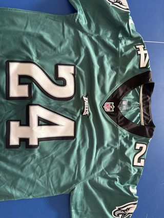 Camiseta de los Philadelphia Eagles de la NFL. - Color verde. - Número 24. - Logo de los Eagles. - Logo de la NFL. - Talla M