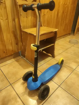 Patinete infantil de tres ruedas en color azul. Desmontable para mayor comodidad para transportar. - Ruedas delanteras dobles para mayor estabilidad. - Plataforma antideslizante. - Manillar ajustable en altura.