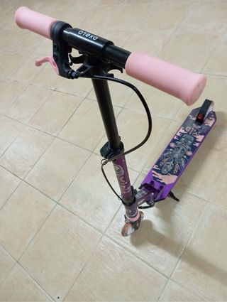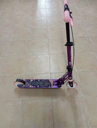 Patinete Oxelo con un diseño llamativo en tonos morados y detalles rosados. - Manillar ajustable en altura. - Ruedas de color claro. - Plataforma con estampado gráfico.