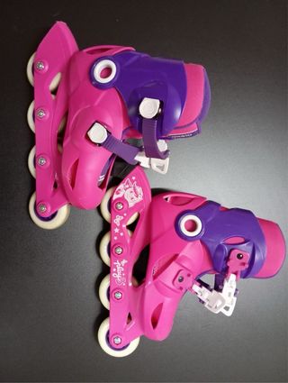 Patines infantiles en color rosa y morado, ideales para niñas. - Talla ajustable: 28-30. - Cierre de velcro y hebilla para un ajuste seguro. - Ruedas resistentes para deslizarse con facilidad.