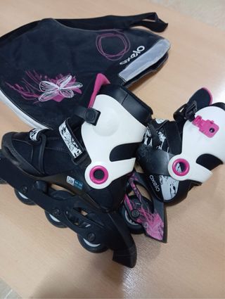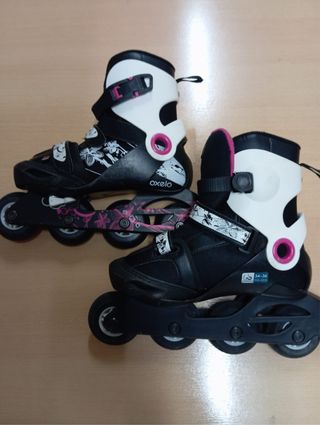 Patines en línea Oxelo para niña, talla 34-36. Diseñados para iniciarse en el patinaje. - Color negro con detalles en blanco y rosa. - Cierre con velcro y hebilla. - Ruedas de 70mm.