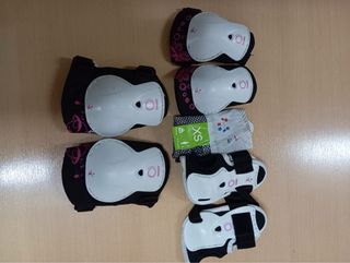Set de protecciones para patinaje infantil de la marca Oxelo. - Incluye muñequeras, rodilleras y coderas. - Diseño con detalles en color rosa. - Talla XS.