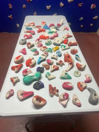 Lote de 100 presas de escalada para rocódromo. Son de diferentes formas, tamaños y colores, ideales para montar o renovar tu pared de escalada. - Variedad de diseños. - Colores: rojo, azul, verde, rosa, blanco, gris y morado. - Material resistente.