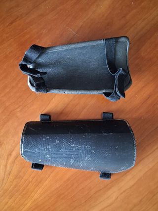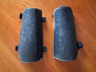 Par de espinilleras negras, diseñadas para la protección deportiva. - Material resistente y duradero. - Cintas de sujeción ajustables. - Diseño ergonómico para mayor comodidad.