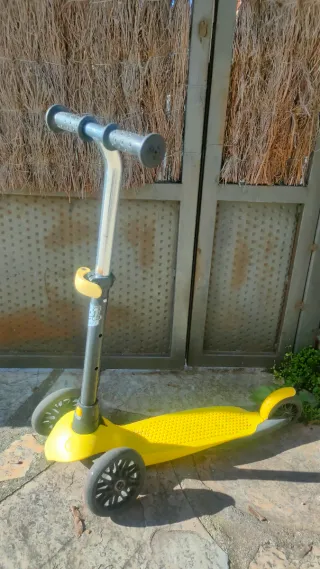 Patinete de tres ruedas de color amarillo con freno trasero - Plataforma antideslizante. - Ruedas de goma. - Manillar ajustable.