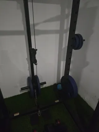 Equipo de gimnasio completo para entrenar en casa. Incluye una jaula multipower rack de la marca Adidas. - Jaula multipower rack Adidas. - Ideal para rutinas de fuerza y acondicionamiento físico - Tiene un remo alto y otro bajo. - Diferentes agarres para remos incluidos. -Accesorios para hacer fondos, incluidos. -Opcional discos olimpicos Ziva, azules, discos de 20, 15, 10 kg 90 kg en total. Precio 180€, 2€ el kilo. -Opcional barra olímpica 50€