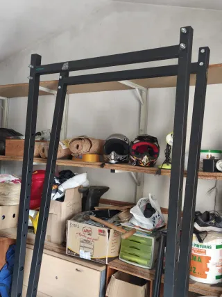 Rack con Barra para hacer dominadas. Anclaje al suelo por 4 puntos. Máximo de peso 350kg Esta en muy buenas condiciones Tiene 28 agujeros para apoyar el peso. - 2,30m alto - 1’20m Ancho - 1’20m Profundidad ***PRECIO 250€*** No se hacen cambios.