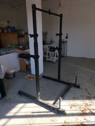 Equipo de gimnasio para entrenamiento de fuerza. - Estructura metálica robusta. - Barras para dominadas integradas. - Múltiples puntos de ajuste para barras y seguridad. Se encuentra en las torres de cotillas (murcia)