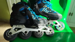 Se venden patines en línea de cuatro ruedas en colores azul y negro de la talla 38. - Diseño deportivo. - Cierre con cordones y velcro. - Ruedas de 60 mm.