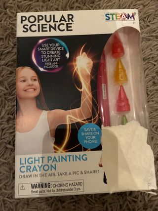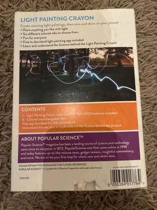 Crayón de pintura de luz de Popular Science. ¡Dibuja en el aire y comparte tus creaciones! en ingles - Incluye app gratuita. - Guarda y comparte tus creaciones en tu teléfono. - Advertencia: Peligro de asfixia. Piezas pequeñas. No apto para niños menores de 3 años.