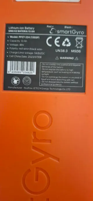 Batería de repuesto para patinete SmartGyro. Color naranja. - Original - Capacidad: 13Ah - Voltaje: 48V - Carga: 54,6V - Conector: XT60 Siempre cargado en buenas condiciones, nunca se ha apurado, y cuando no se ha utilizado se ha puesto en storage, ideal para tener más autonomía o de repuesto, regalo conector de carga