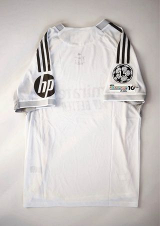 Camiseta de fútbol del Real Madrid, versión jugador. - Color blanco con detalles en amarillo y gris. - Logo de Adidas y escudo del Real Madrid. - Patrocinador Emirates Fly Better. - Parche UEFA Foundation 15 años. - Logo de HP en la manga. - Talla M.
