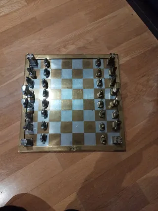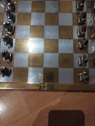 Elegante juego de ajedrez con un diseño moderno y minimalista. Las piezas y el tablero combinan acabados metálicos en tonos dorados y plateados, aportando un toque sofisticado. - Tablero a cuadros dorados y plateados. - Piezas de ajedrez con diseño geométrico. - Materiales metálicos. Ideal para regalos bodas