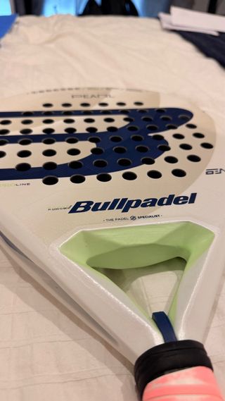 Pala de pádel bullpadel marca Pearl con acabado Fibrix y núcleo Multieva. Diseñada para un juego versátil. - Peso: 355-365 gramos. - Grosor: 38mm. - Forma: Diamante. - Balance: Alto.