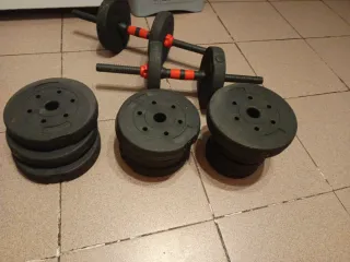 Set de pesas para entrenamiento en casa. Incluye barras y discos. - Peso total: 15 kg. - Dos barras cortas con agarre para formar mancuernas. - Una barra extra para formar una barra larga con las mas pequeñas. - Ocho discos de 1,5kg cada uno. - Cierres de rosca para las barras.