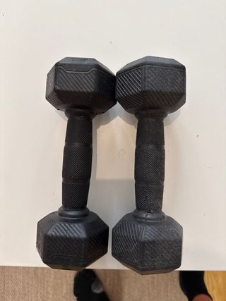 Conjunto de mancuernas de diferentes pesos, ideales para entrenar en casa. - Dos mancuernas de 5 kg. - Dos mancuernas de 7.5 kg. - Diseño hexagonal para mayor estabilidad.