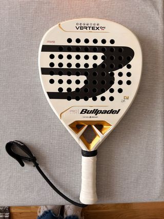 Pala de pádel Bullpadel Vertex 04 W Pro Line Delfina Brea en color blanco y negro con detalles dorados. Diseñada para un juego avanzado. - Pala de pádel Bullpadel. - Modelo Vertex 04 W. - Línea Pro Line. - Combinación de colores blanco, negro y dorado. Es muy ligera, actualmente con el protector, grip que trae mas un overgrip pesa 365gr. Esta en perfecto estado, sin ningun golpe ni marca.