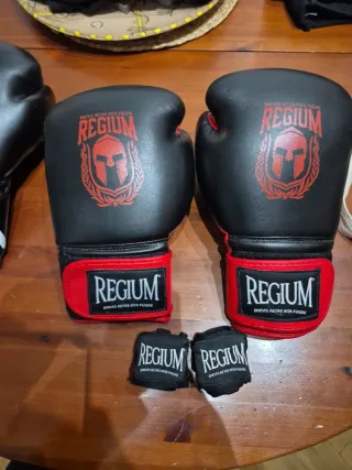 Par de guantes de boxeo de la marca Regium, con un peso de 14 onzas. Diseñados con un acabado negro y detalles en rojo. - Marca: Regium - Peso: 14 oz - Color: Negro y rojo - Incluye vendas de boxeo a juego.