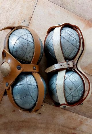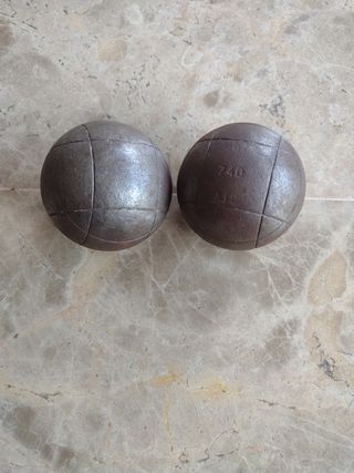 Juego de 4 bolas de petanca antiguas, en buen estado. - 4 bolas de metal, con marcas de uso. - Dos estuches de cuero para transportar las bolas. Pesan unos 600 gr cada una