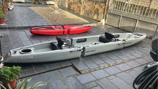 Vendo mi kayak hobie revolution 13 en buen estado. Propulsión por motor eléctrico, a pedales o pala, con muchos extras de la marca hobie: aletas turbo, asiento i-confort, cajas de tambucho delantero y trasero, kit de ancla con poleas en proa y popa, pala, transporte de cañas en el costado, cubo almacenaje en tambucho de proa (hobie hatch liner), kit de reparación (aleta, cadena, etc...), carro con ruedas globo, 2 RAM universal ball 1”, sonda Lowrance Elite-4x, motor eléctrico adaptado al timón bixpy J2, con batería de litio flotante de 25,2V y 378 Wh , mando a distancia y desconectador "hombre al agua".