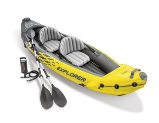 Kayak hinchable Intex Explorer K2 para 2 personas. Ideal para disfrutar del agua. - Incluye remos y bomba de inflado. - Diseño en color amarillo y gris. - Modelo Explorer K2. PRECIO DEL MERCADO 121