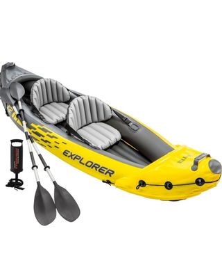 Kayak hinchable Intex Explorer K2 para dos personas. Ideal para disfrutar de paseos por el agua. - Diseño en color amarillo y gris. - Incluye remos y bomba de inflado.