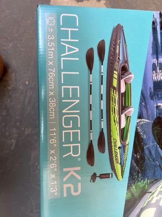 Kayak hinchable Challenger K2 de Intex, ideal para dos personas. Incluye remos y bomba. Está en garantía,comprado hace solo dos meses - Diseño deportivo en verde y negro. - Material resistente. - Incluye dos remos. - Bomba de inflado. - 2 asientos hinchables. - Chaleco salvavidas.