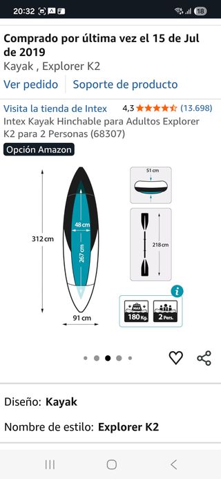 vendo este Kayac que está en su caja original. Lo compré en julio con mi pareja pero nos separamos y nunca lo hemos usado. Tengo el ticket decir aún entra en garantía obviamente, kayac hinchable Intex Explorer K2, nuevo y sin abrir en su caja original. Ideal para dos personas. - Modelo: Explorer K2 - Capacidad: 2 plazas - Incluye inflador, quilla y 2 remos.