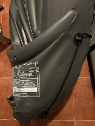 Para dos personas (máximo 180 kg), medidas 351x76x38 cm. Fabricado con vinilo de alta resistencia de 0,75 mm de grosor. Suelo hinchable y con tecnología, Beam de INTEX, dos asientos hinchables, desmontables y regulables y quilla desmontable. Incluye 2 remos dobles de aluminio y longitud de 218 cm, 1 hinchador manual, 2 cuerdas de sujeción, red porta objetos en la parte delantera y kit de reparación. Optimo para travesías por lagos y ríos. No se usa y he comprado un kayak rígido. Solo 2 usos, prácticamente nuevo.