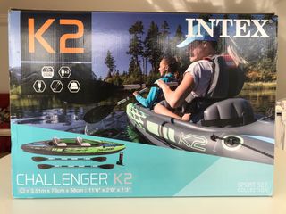 Kayak inflable Intex Explorer K2, ideal para dos personas. Su diseño es llamativo y deportivo. - Incluye remos y bomba. - Prácticamente sin uso. - Se puede configurar para una o dos personas. - Apto para lagos y ríos de aguas tranquilas.